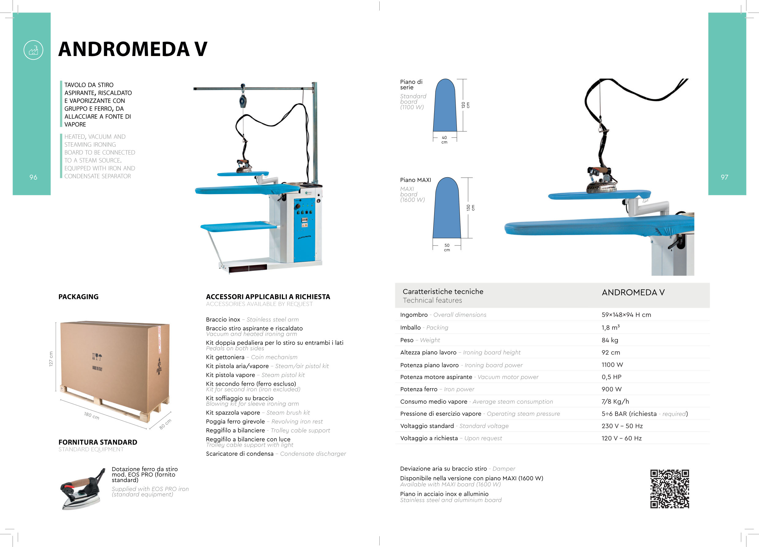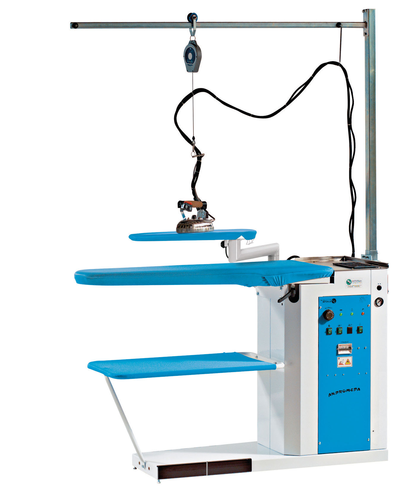 Tavolo da stiro aspirante, riscaldato e vaporizzante con gruppo e ferro, da allacciare a fonte di vapore. Motore di aspirazione da 0,5HP.