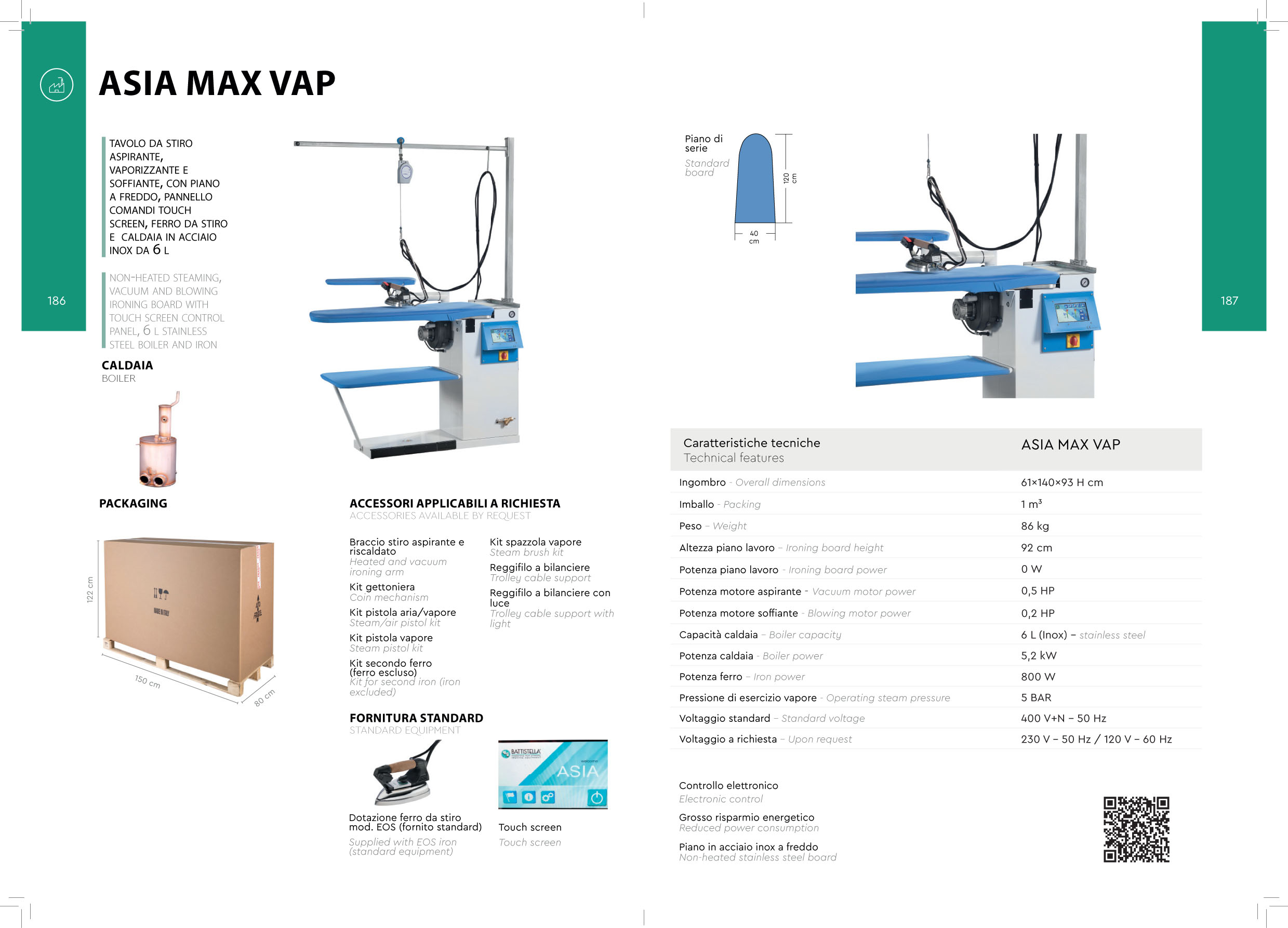 Tavolo da stiro aspirante, vaporizzante e soffiante, con piano a freddo, pannello comandi touch screen, ferro da stiro e caldaia in acciaio inox da 6 l.