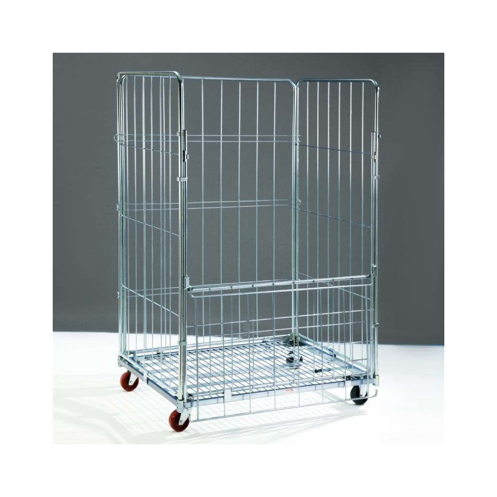 Il roll container scaffale è il contenitore su ruote, ideale per il trasporto delle merci dai magazzini centrali a quelli periferici e nel settore lavanderia, per il trasporto e il ritiro della biancheria. E’ utilizzato anche nel settore recupero carta/cartone presso esercizi commerciali e isole ecologiche. Realizzato con pareti in tubo tondo, agganciate tramite delle molle di fissaggio alla base, può essere facilmente smontato per un rapido immagazzinamento con recupero dello spazio durante i trasporti di ritorno a vuoto. La IV parete è dotata di un antello apribile a ribalta. Le dimensioni unificate al pallet lo rendono capiente ed è ottimizzato per la spedizione all’interno dei camion.