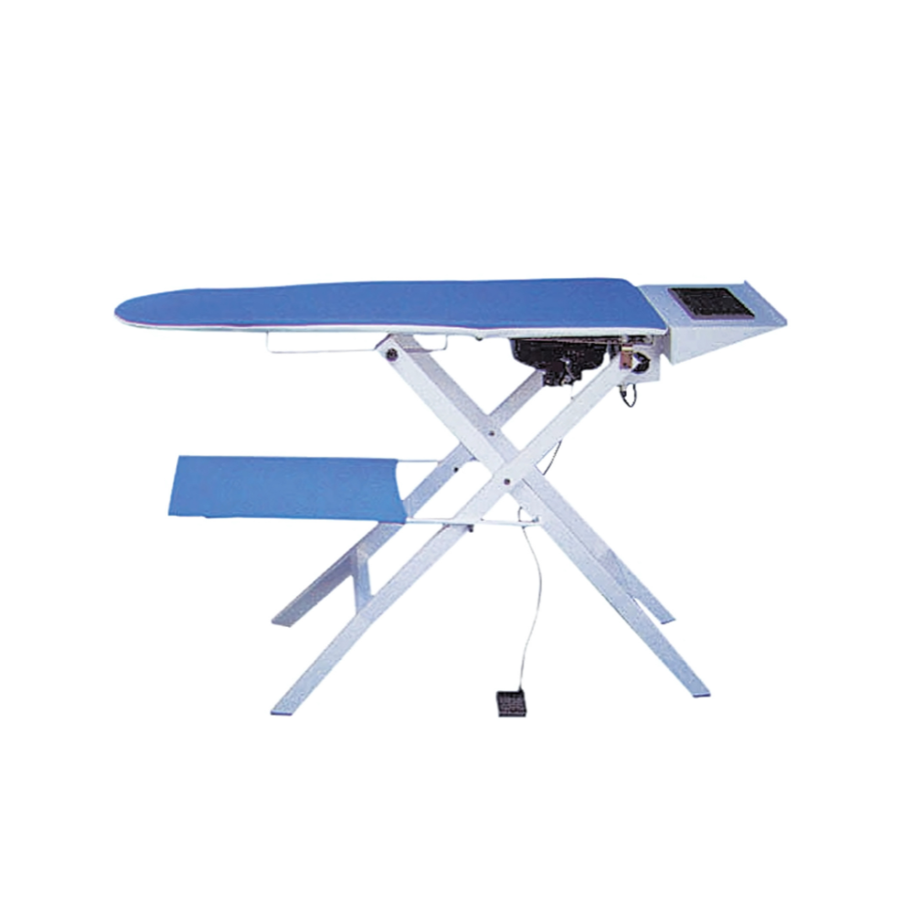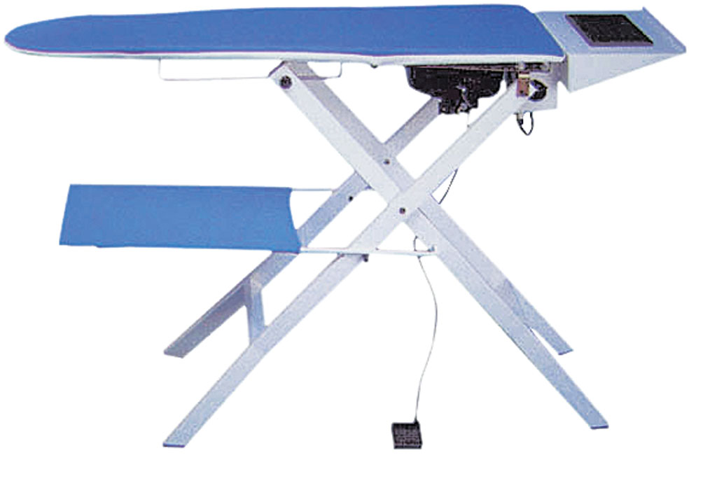 Tavolo da stiro con piano di supporto per qualsiasi generatore, piano aspirante e riscaldante con pedale di comando aspirazione. Regolabile in altezza, Dimensioni piano stiro cm 37×110. Peso 21 kg. Alimentazione 230V 50Hz. Ideale come secondo tavolo o laboratorio.